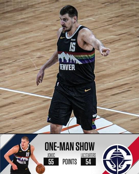 天下第一的实力,约基奇一人砍55分,快船首发五人合计54分