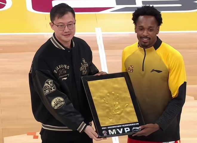 广厦外援布朗领取上赛季的总决赛MVP手模。